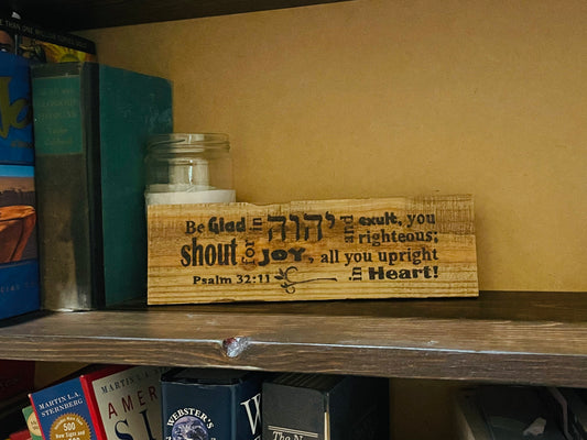 Psalm 32:11, "Be glad in יהוה..." Wood burned Scripture